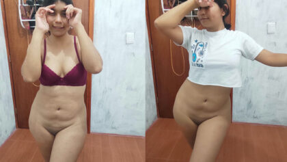 Una jovencita curiosa con su móvil, se para frente al espejo y empieza mostrando sus tetas, luego se emociona se